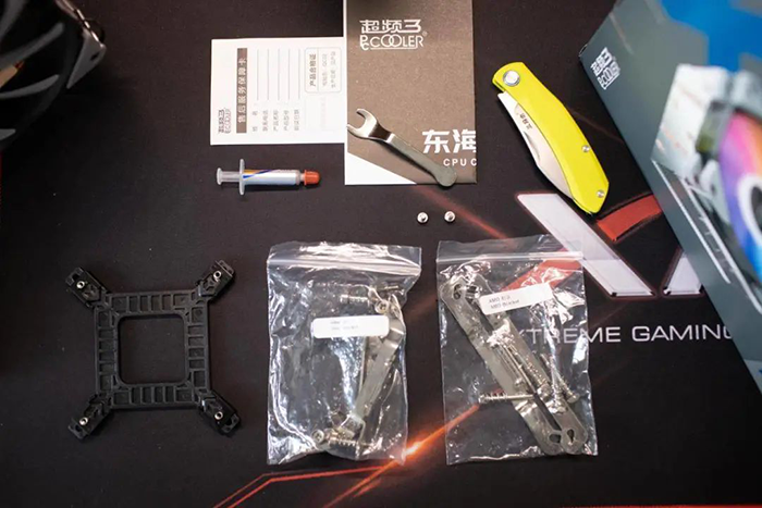 打开包装可以看到风扇和散热塔有海绵泡沫支架保护,配件有独立包装盒收纳。