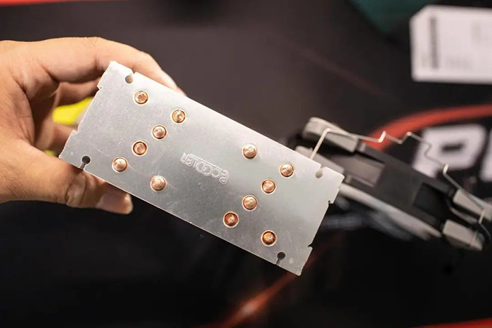 散热塔使用了大面积的散热鳍片,排列整齐细密,穿FIN+扣FIN工艺也非常精细。
