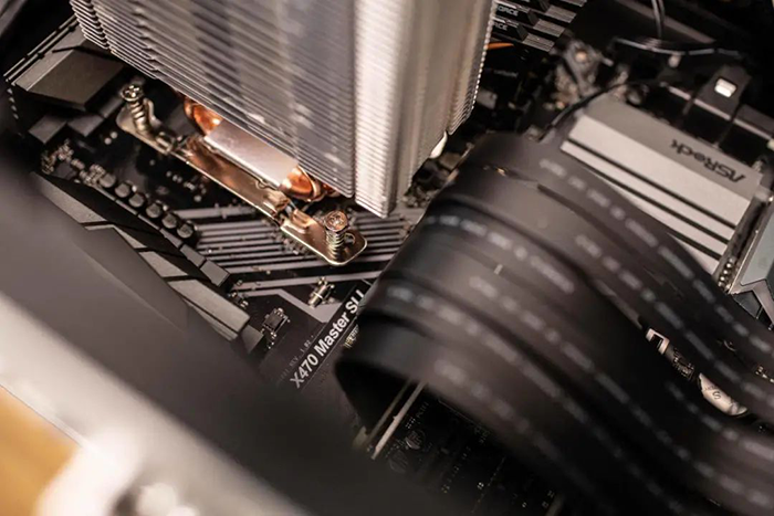 从侧边看,12cm的风扇和散热塔基本保持一致,固定方式是传统的弹簧扣具。