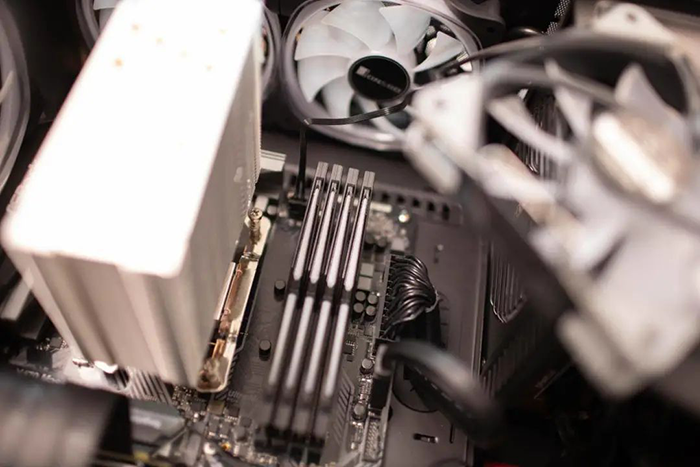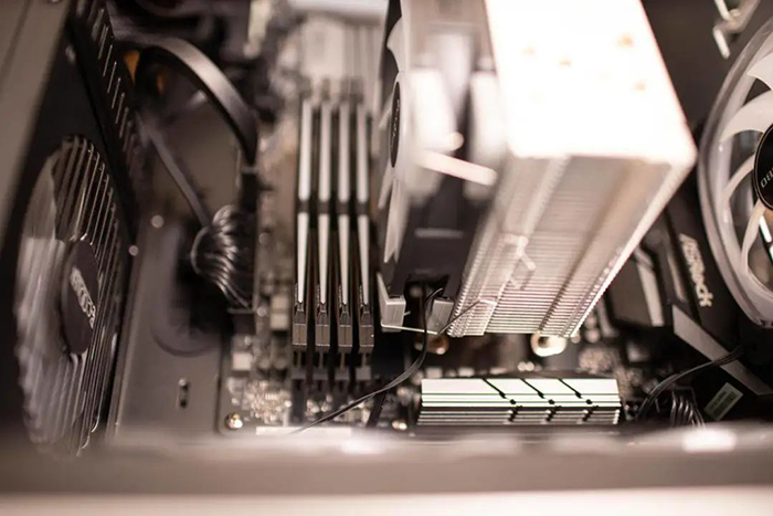 安装风扇后,散热器和内存之间其实还有保留了一定的余量,这个角度还能看到明显的间隙。