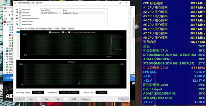 开启FPU模式,烤机3分钟以上,CPU核心温度稳定在89℃。