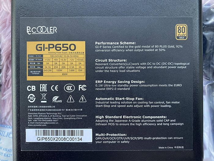 电源铭牌。和850W版本除了12V从单路849.6W降成了单路649.2W,其余参数均一致。