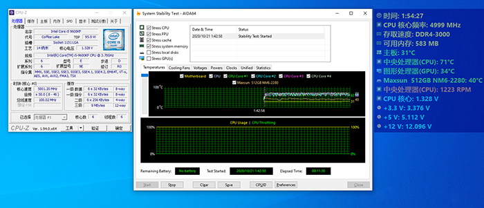 用过AIDA64满载测试,大霜塔比较成功的压制了处于5GHz的i5 9600KF,经过10多分钟的测试,CPU的温度在70~73℃上下浮动。