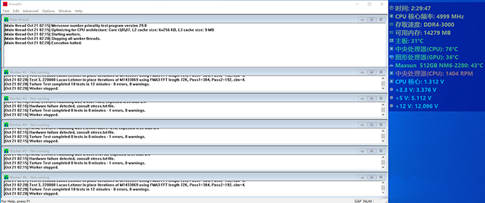 跑了10分钟P95选项二,CPU温度在76~80℃浮动,温度表现也算中规中矩。风扇也达到了满载状态。