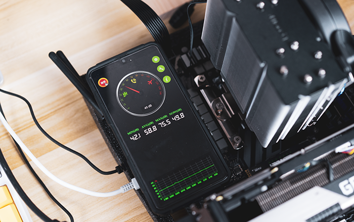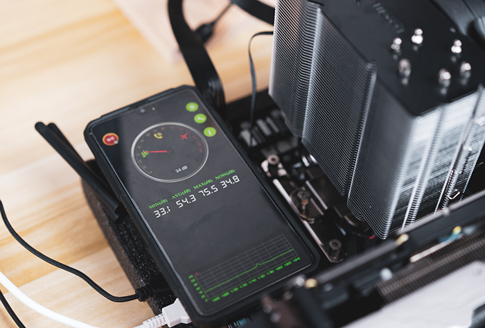 噪音环节,我因为不小心把分贝仪踩坏了,来不及重新买,就直接用手机APP测试,当然这测试成绩就看看,误差可能比较大。将手机放在出风口处,大霜塔双风扇满载,手机APP显示在50分贝上下,50%的转速,在41分贝上下,所以如果装在机箱内,声音也不算太大。