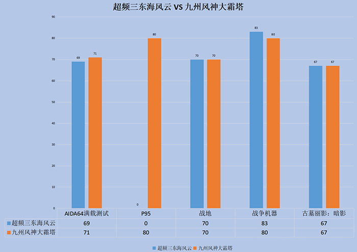 经过一系列测试,可以下结论了:更大的九州风神大霜塔是不是完虐超频三东海风云?答案当然是否定的,甚至九州风神大霜塔在一些环节上还有劣势。而超频三东海风云作为一个单塔单风扇的散热器,能与双塔双风扇的散热器并驾齐驱,无疑也是一种胜利。当然,要说这背后的原因,我觉得可能与热管的导热效率或者风扇转速有关,甚至还可能是CPU电压等等。但也让我觉得在购买散热器上也不用迷恋双塔双风扇就是正义,单塔单风扇一样有表现出色的产品,这也步枪一样,谁说口径小,杀伤力就要打折扣?
