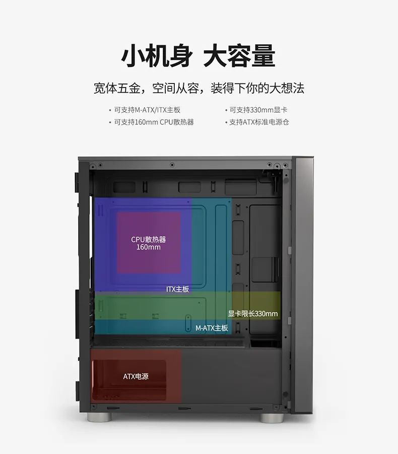 支持M-ATX/ITX主板、330mm规格显卡、160mm 高度