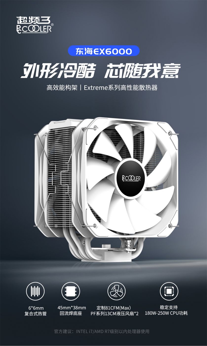 东海EX6000的定位于高端塔式风冷散热器。产品在设计之初,针对英特尔i7/AMD R7级别处理器默频以及超频发热量,采用高效能散热构架,足以稳定压制I7/R7级及以下CPU,给游戏玩家和PC发烧友提供更强劲的散热保障。