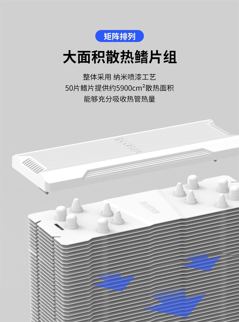 EX6000共有50组纯铝散热鳍片,约提供5900平方厘米散热面积,有白色\黑色两种颜色可以选择,白色版采用纳米喷涂工艺,黑色版采用电泳黑化工艺,具有良好的抗氧化、防腐蚀效果。