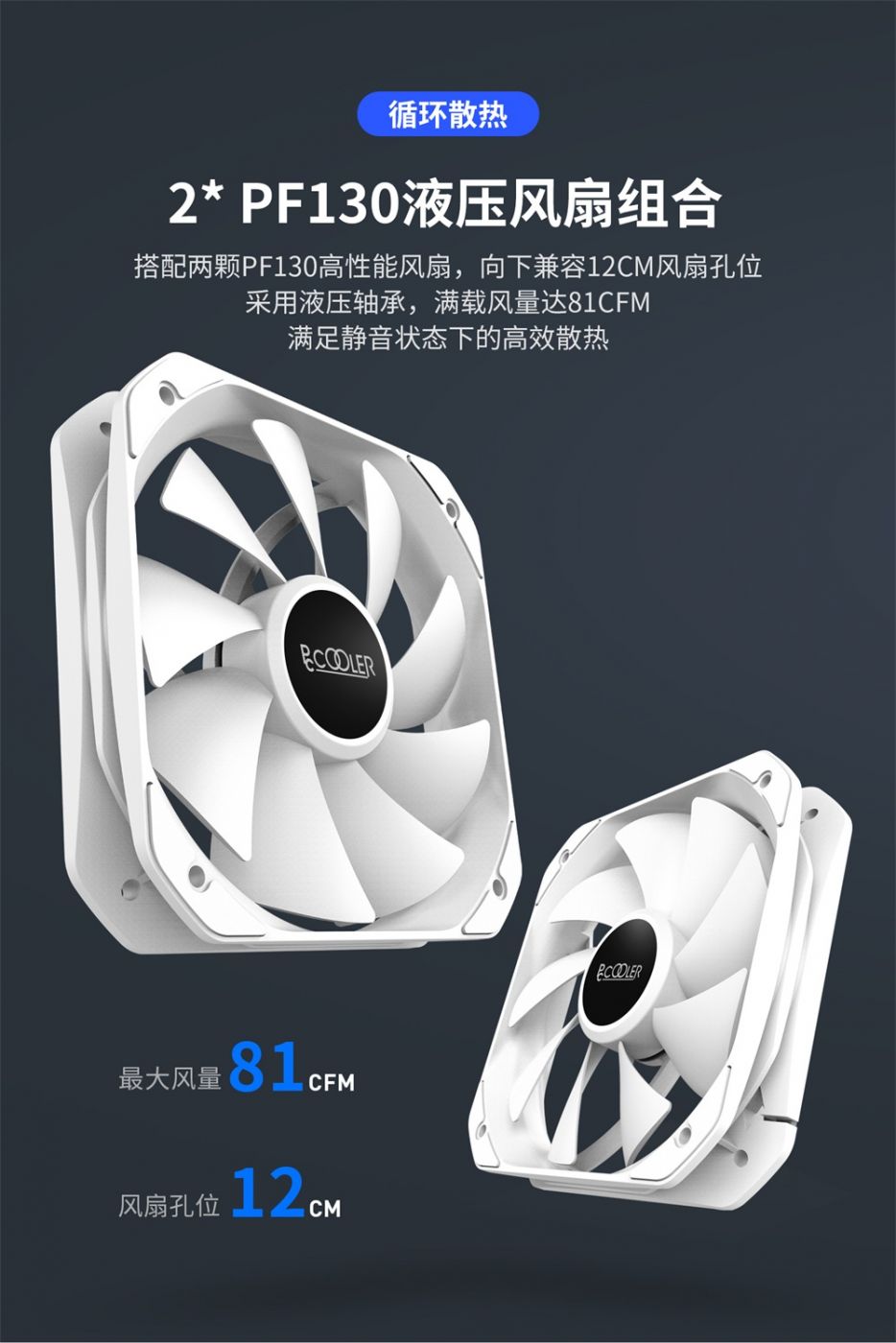 东海EX6000配备了两颗PF130风扇,采用正反叶扇设计,整体性非常好,PF130是一款业内首创的13厘米非标准尺寸风扇,向下兼容12厘米风扇孔位,最大风量81CFM,风压2.18MM/H2O,风扇转速为800-1600±,支持PWM智能调速功能,对比传统的12厘米尺寸风扇,在保持同等转速情况下,风噪音更低,风量更大,能更快、更迅速带走热量。