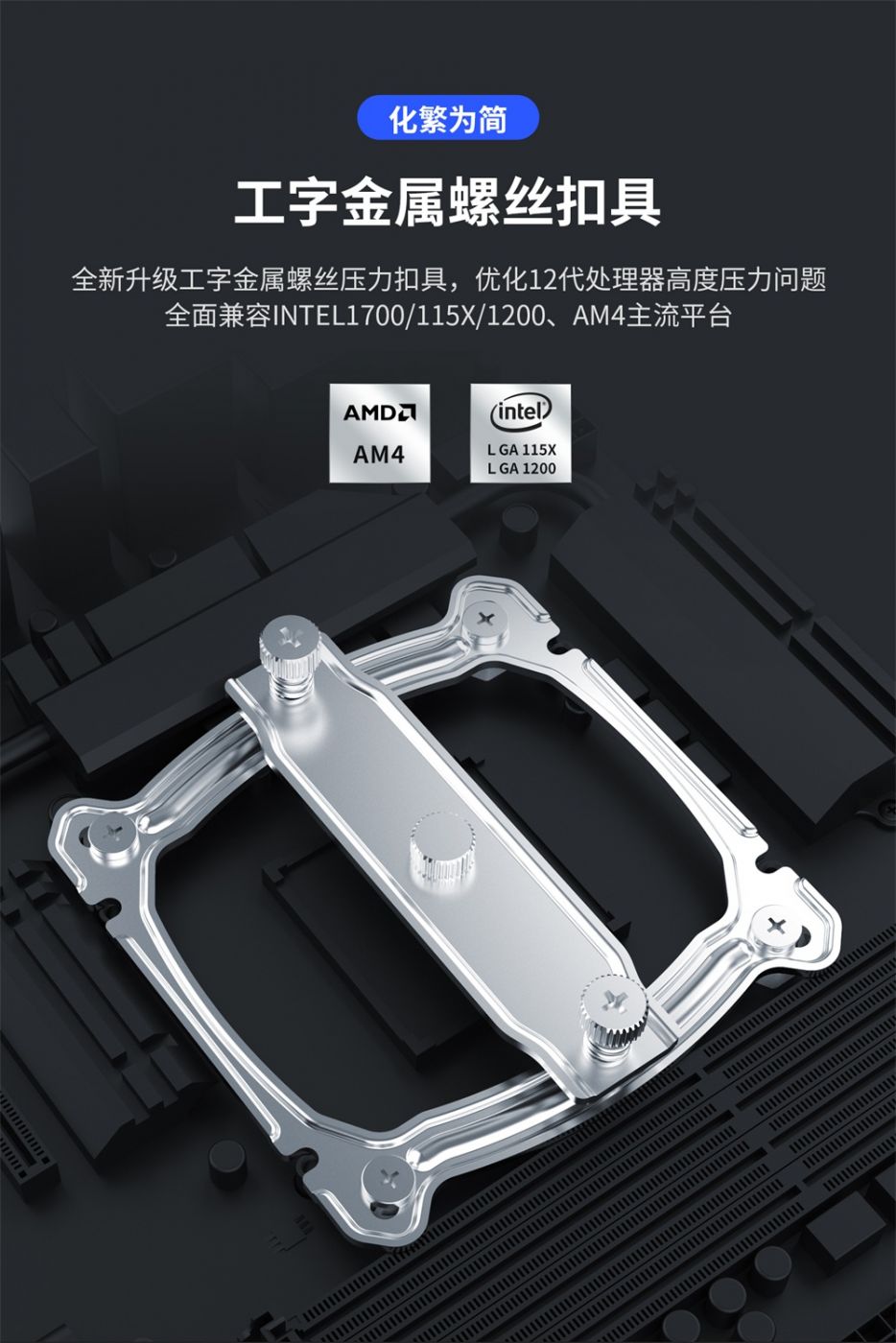 全新升级工字金属螺丝压力扣具,优化12代处理器高度压力问题,全面兼容INTEL1700/115X/1200、AM4主流平台。