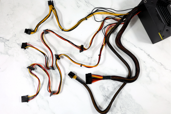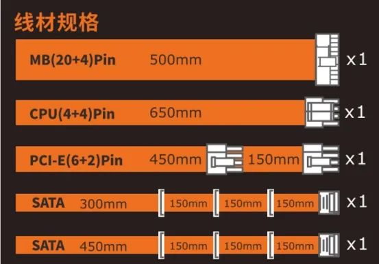 这款电源提供了多种不同类型、不同功能的线材,可以满足多种装机配件所需。线材长度也挺长,最多有80cm长,完全足够走背线。值得一提的就是它提供了原生的双8pin PCI-E接口,按理论公式计算供电可达75+150+150=375w,直接支持高端显卡。从这个角度也能看出这款的电源的线材部分采用了非模组设计,这也和平价的定位有关,非模组能有效降低成本。