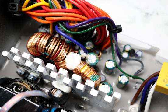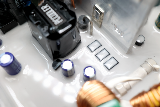 ▲最后就是稳压输出回路了,因为没有采用模块化设计,所以输出线路的线材都是直接焊在PCB基板上被硅胶封闭的。两个线圈之间还用了绝缘硅胶分离。