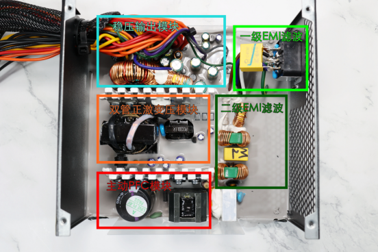▲电源内部的电路结构采用常见的三段式设计,由散热片分隔开,从上到下分别是稳压输出回路、双管正激模块、主动PFC模块,整体布局很规整、紧凑,没有以往廉价电源的杂乱设计。我们一个一个来分析。