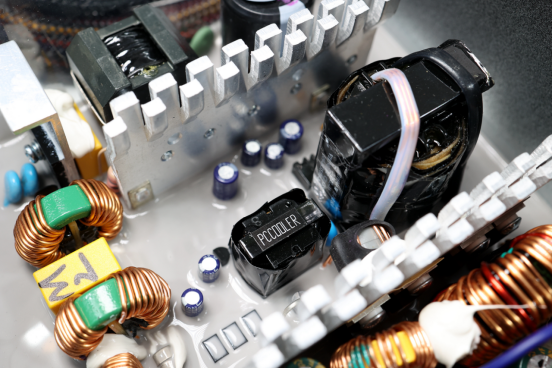 ▲电源内部结构清晰,元器件排列整洁有序。但给人最奇特的地方就是本该裸露的绿色或黄色PCB基板不见了,整个基板上连同封装好的元器件全部灌注了一层厚厚的高导热性硅胶密封起来。
