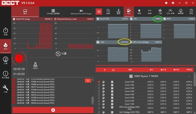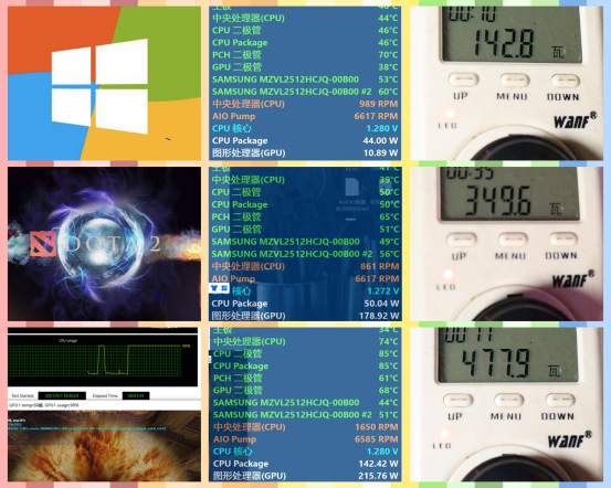 安排了待机/典型负载(臭打游戏)/满载(双拷机)三种环境来测试电源的输出能力。